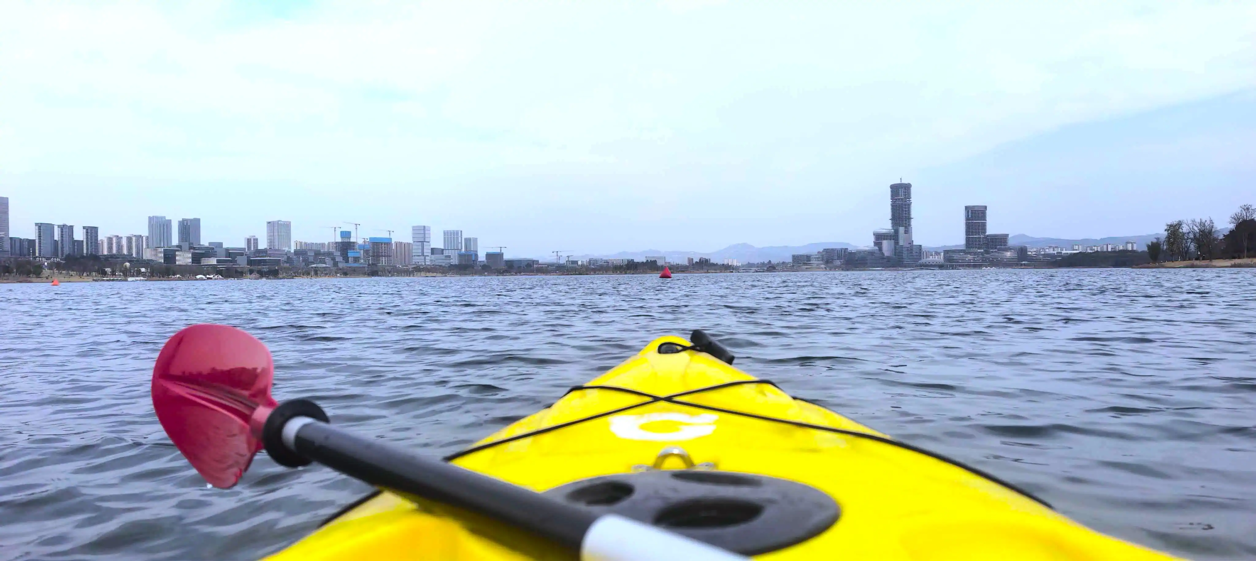 聊了一个多小时,阳光没那么猛烈了,我们下水去划船。这里的船类似于皮划艇,工作日单人船68元不限时,节假日则限制一小时。这个皮划艇划得比以前划过的船都要省力,掌握发力方式后能前进得特别快,而且很灵活。