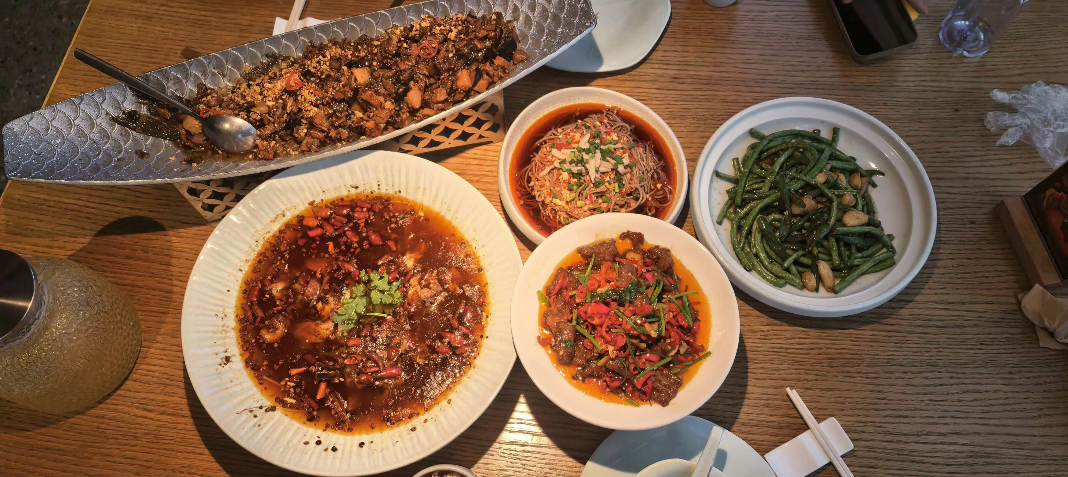 晚饭时间,我们打车去了麓湖觅食。这里有许多饭店,但是人很少,这些饭店员工的数量都比游客数量多。我很喜欢这种人少的地方。最后选定的饭店是一家川菜店“渔盼·川菜小馆”,店比较高端,环境不错。这家店建在一个山坡的顶端,窗户的视野非常好,我们选了个靠窗的位置。